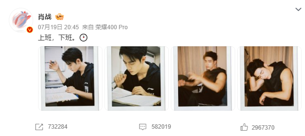 7月19日,@肖战改名后首发博文“ 上班,放工。???? ”并配图四张,向网友寄来明信片,“肖战改名后首发博”冲上热搜。